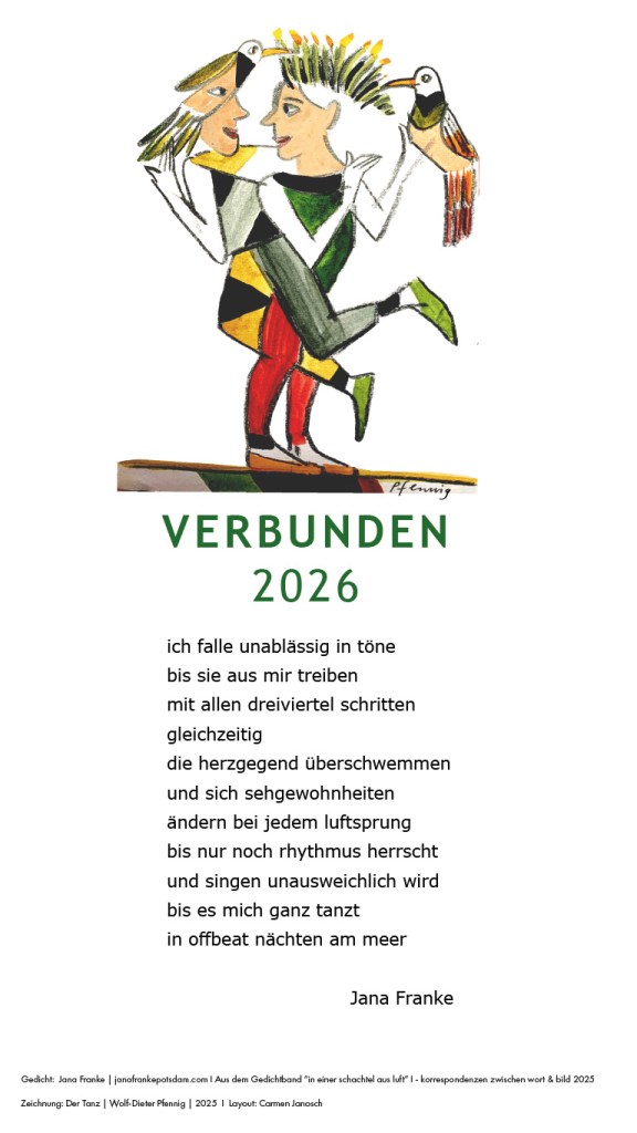 Jana Franke und Wenzel Benn sind Mitglieder der Reihe „wort trifft ton & bild“, die Literatur, Malerei und Musik miteinander verknüpft. Beim Auftritt im Innenhof des Landtages trug die Autorin auch das bisher unveröffentlichte Gedicht „Stolpergoldstein“ vor, das eigens für diese Veranstaltung geschrieben wurde. Zudem las sie aus dem Dreiakter „WendeZeiten“, einem Text aus der kürzlich erschienenen Sammlung „Hier ist herrlich arbeiten: Begegnungen mit Schriftstellerinnen und Schriftstellern aus Brandenburg“.