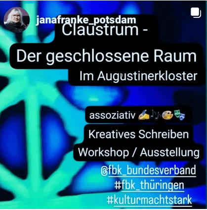 Es war nicht die letzte Herausforderung für Jana Franke (sie trug ihren Text nach Lesungsschluss noch einmal vor – und alle blieben sitzen und hörten zu), denn während sie einen anderen Text las, begannen die Kirchenglocken zu läuten. … Eine rundum gelungene Veranstaltung, trotz der technischen Hindernisse. Wir standen anschließend mit einigen Zuhörern zusammen, mit Frau Lehmann vom Memento e.V., und stießen auf …