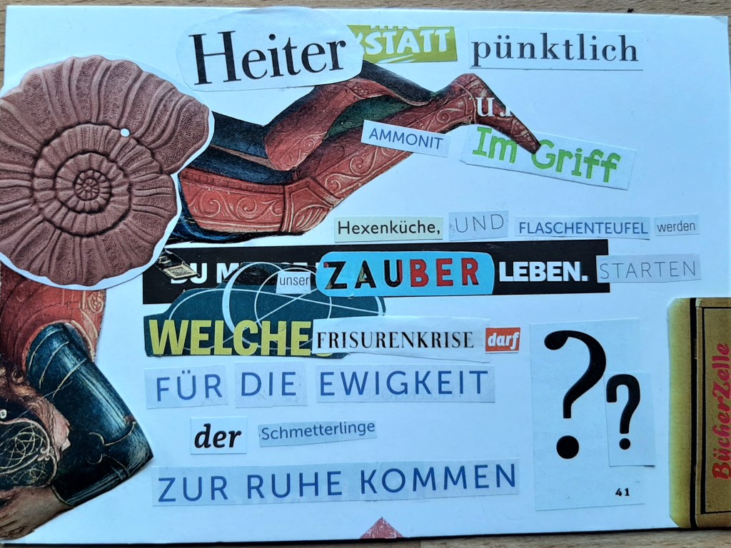 Ich mag das automatische Schreiben sehr, die Haikus und ich mag es, Sinneserfahrungen in Texte einzubringen. … Diese Ergänzung/Erweiterung der Texte finde ich sehr schön. Und ich habe an Collagen noch nie gemeinsam mit anderen gearbeitet. Das war spannend, knifflig und lustig.