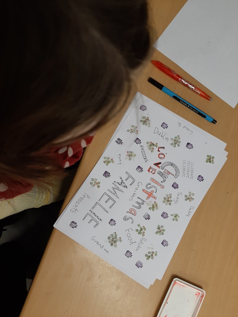 Jeder schreibt, stempelt, malt, singt, redet, was für ihn das Weihnachtsfest ausmacht. Dann schauen sich alle die Blätter der anderen an und reden darüber.