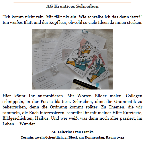 Ein Wort aus dem eigenen Text aussuchen. Es stempeln, wie man will und dann Inhalte/ Eigenschaften, auch mal Phantasiewörter zu jedem Buchstaben finden, die den Begriff erweitern.